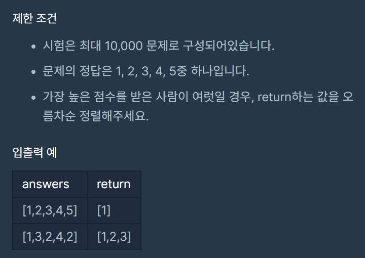 시험 문제의 정답이 주어졌을 때, 1번, 2번, 3번 수포자의 점수를 구한 다음 높은 점수를 받은 수포자의 번호를 구해야 하며, 여러 명인 경우 오름차순으로 정렬하여 출력해야 한다.