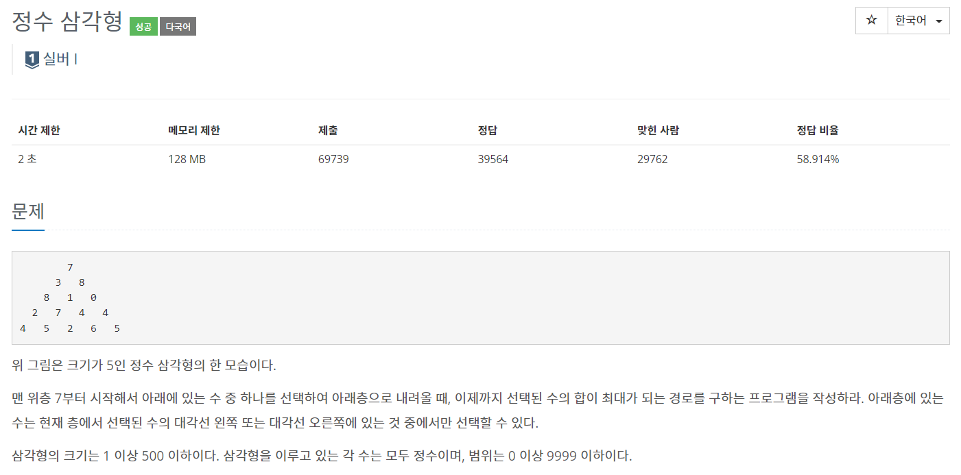 맨 위층부터 시작해서 아래에 있는 수 중 하나를 선택하여 아래층으로 내려올 때, 이제까지 선택된 수의 합이 최대가 되는 경로에 있는 수의 합을 구해야 한다.