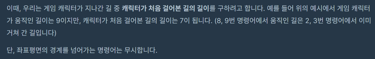 캐릭터가 지나간 길을 저장하는 Set 타입 변수를 사용하여 캐릭터가 처음 걸어본 길의 길이(Set의 크기)를 구한다.