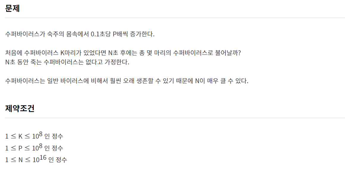 다만 k, p,가 최대 10^8이 될 수 있고 n은 10^16이 입력으로 들어올 수 있기 때문에 k * (p^10n)을 아래 풀이와 같이 직접 구하면 시간초과가 뜬다.