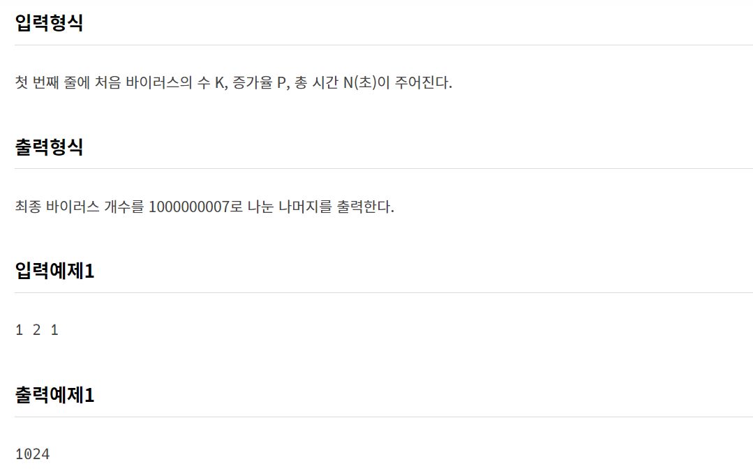 최종적으로 출력할 값은 최종 바이러스 개수를 1000000007로 나눈 나머지이므로, 곱셈을 할 때마다 1000000007로 나눈 나머지값을 구해서 반환하면 정답을 구할 수 있다.