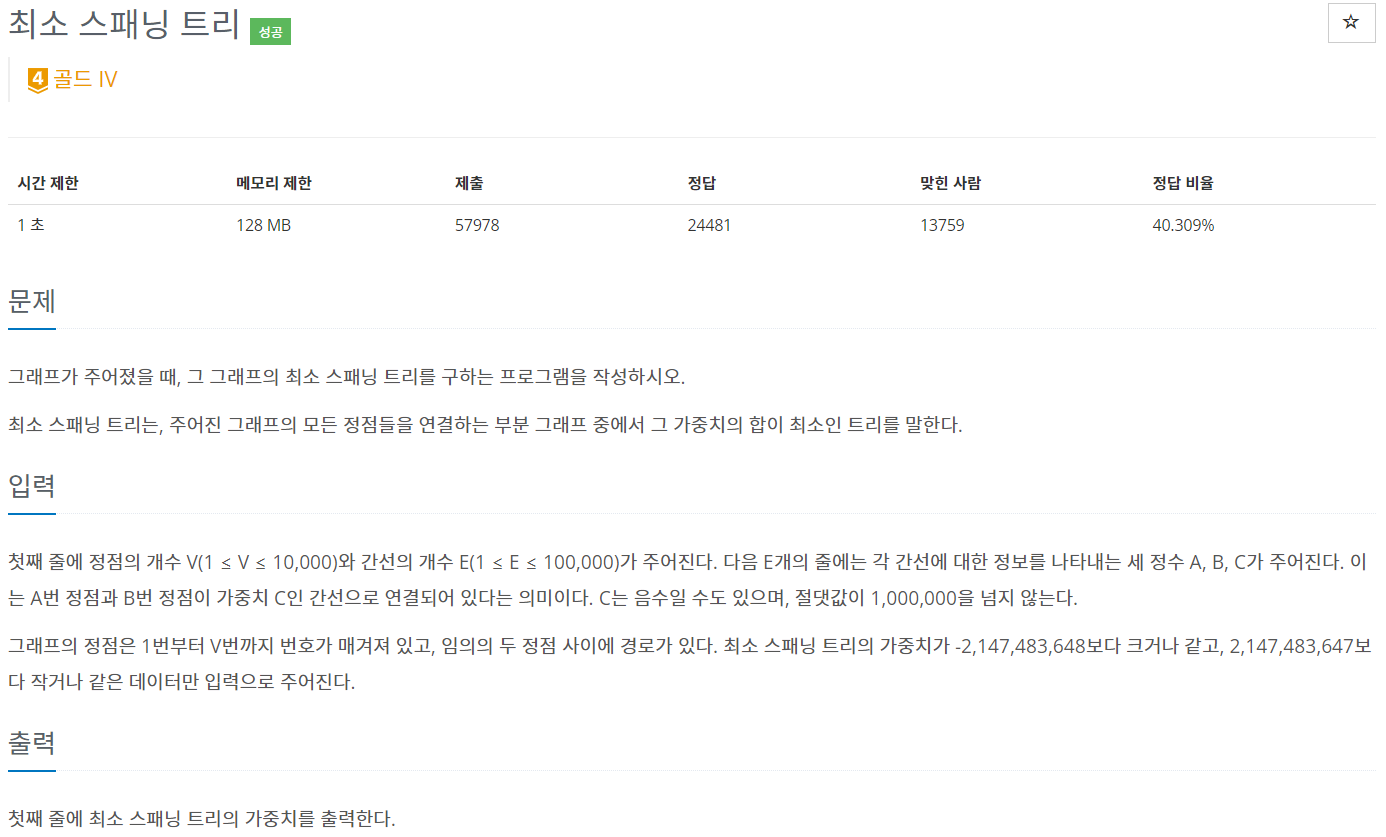 첫째 줄에 정점의 개수 V(1 ≤ V ≤ 10,000)와 간선의 개수 E(1 ≤ E ≤ 100,000)가 주어진다. 다음 E개의 줄에는 각 간선에 대한 정보를 나타내는 세 정수 A, B, C가 주어진다. 이는 A번 정점과 B번 정점이