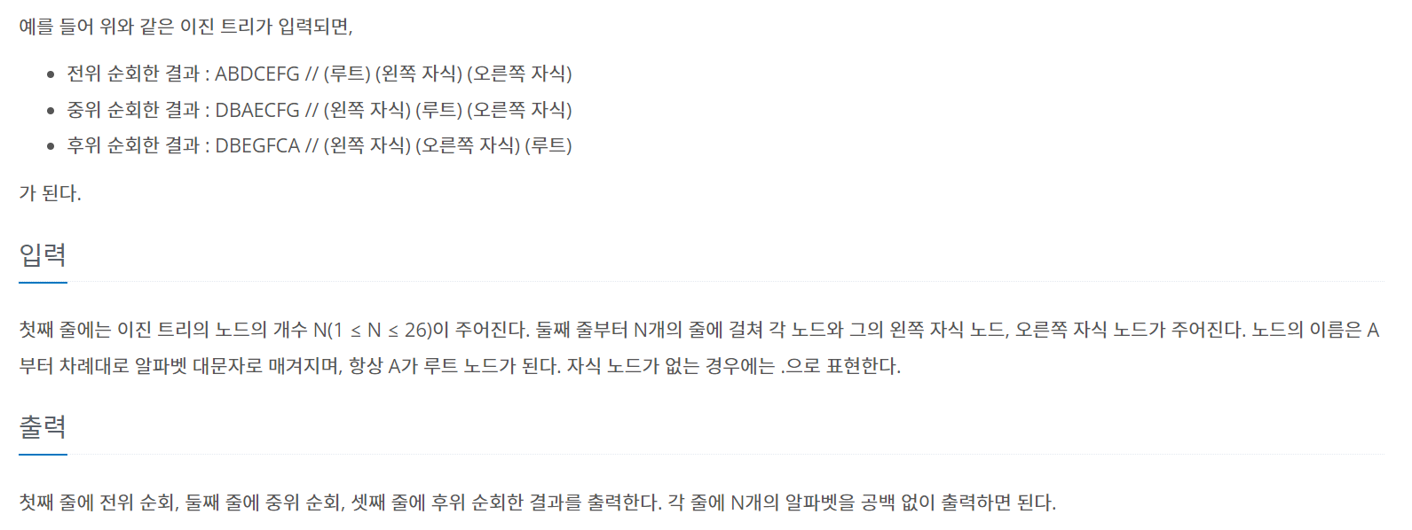 첫째 줄에는 이진 트리의 노드의 개수 N(1 ≤ N ≤ 26)이 주어진다. 둘째 줄부터 N개의 줄에 걸쳐 각 노드와 그의 왼쪽 자식 노드, 오른쪽 자식 노드가 주어진다. 노드의 이름은 A부터 차례대로 알파
