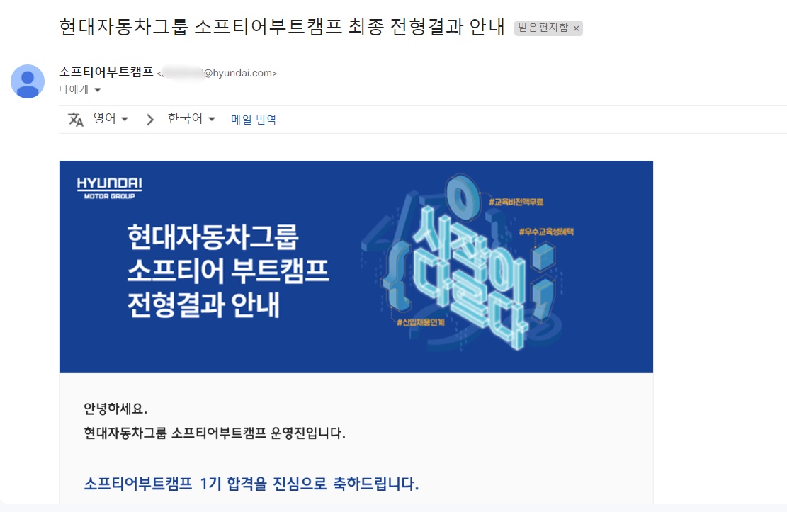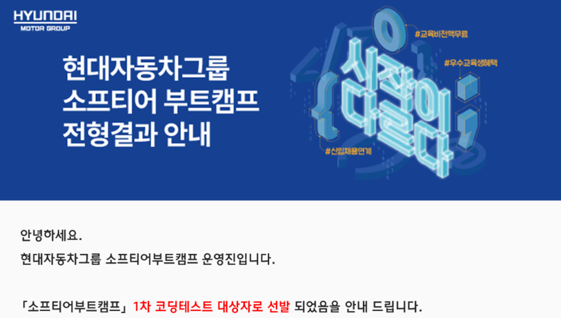 이 때 우아한 테크코스도 같이 병행하며 준비했었는데, 우아한 테크코스는 최종 코딩테스트도 보지 못하고 불합격했었지만 현대 소프티어 부트캠프는 합격한 메일이 와서 너무 기뻤다!