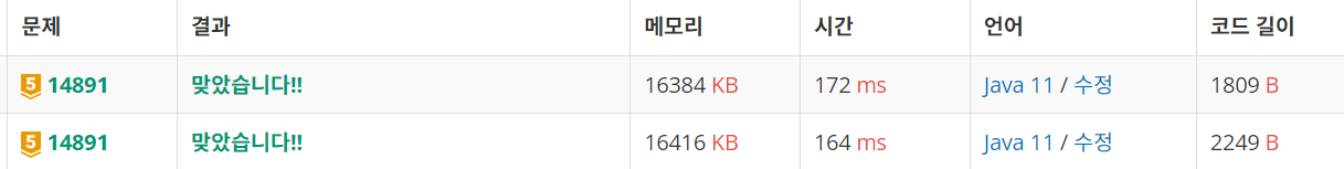 - lotate() -> compare 순서가 아니라, compare부터 한 다음 lotate()함으로써 회전 전 톱니바퀴의 상태를 저장할 필요가 없어졌다. 또한 main() 메서드에서 중복되는 부분(현재 톱니바퀴 회전 로직과, 이후 톱니바퀴를 회전시키는지 판별하는 로직)을 제거하였다.