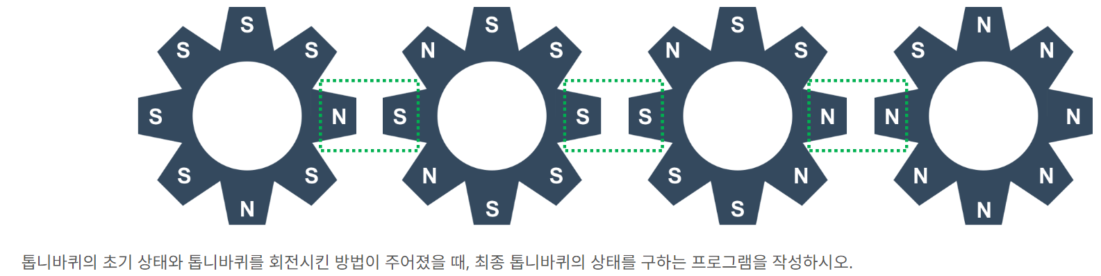 총 8개의 톱니를 가지고 있는 톱니바퀴 4개가 아래 그림과 같이 일렬로 놓여져 있다. 또, 톱니는 N극 또는 S극 중 하나를 나타내고 있다. 톱니바퀴에는 번호가 매겨져 있는데, 가장 왼쪽 톱니바퀴