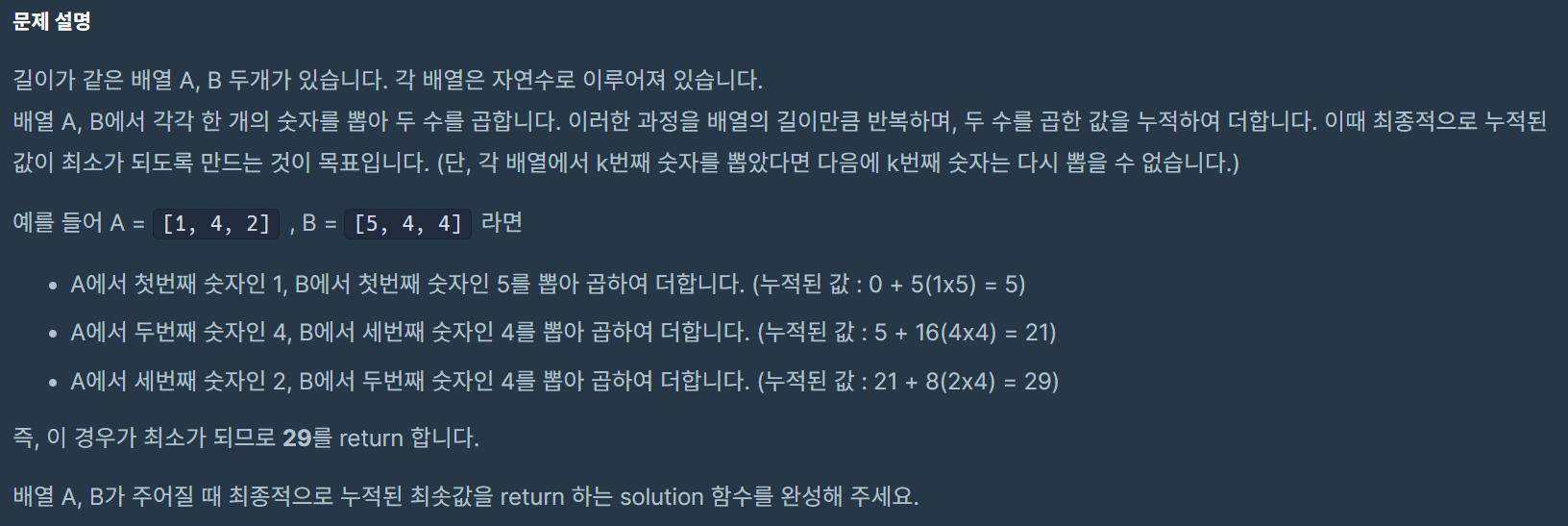 위 예시를 살펴보면, A를 오름차순하고 B를 내림차순한 다음 순서대로 곱해서 누적해서 더한 값이 최소가 되는 것을 알 수 있다.