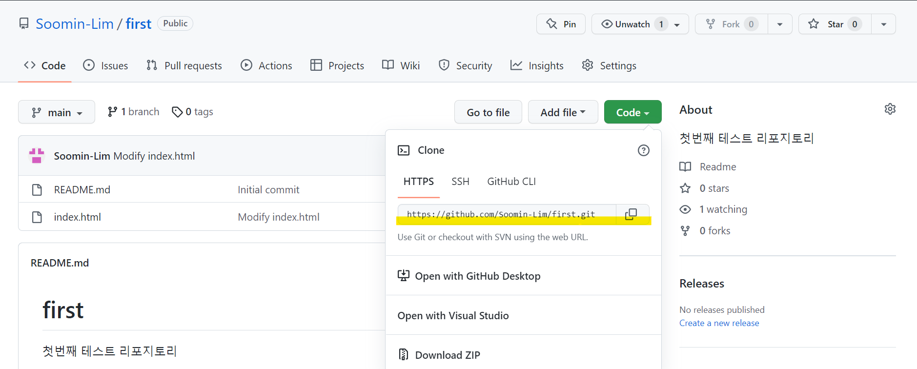 리포지토리 화면에서 코드를 수정할 수 있지만 다음과 같은 방법으로 코드를 수정할 수 있다.