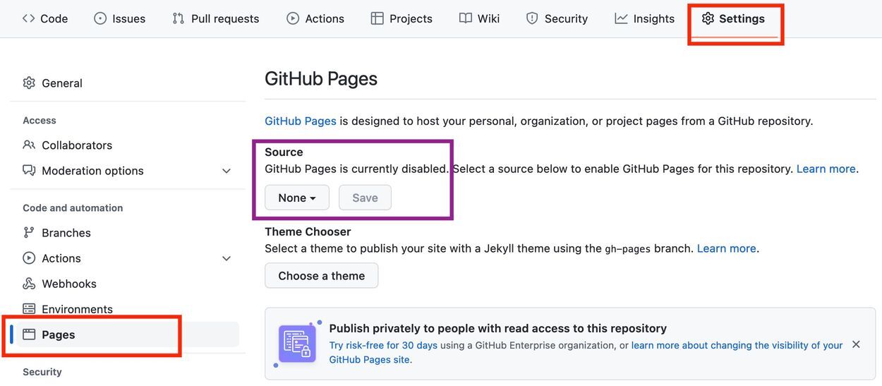 2) 웹 페이지를 생성하고자 하는 레파지토리에 들어간 후, 우측 상단의 Settings를 클릭하고, Settings 페이지에서 Pages를 클릭한다.