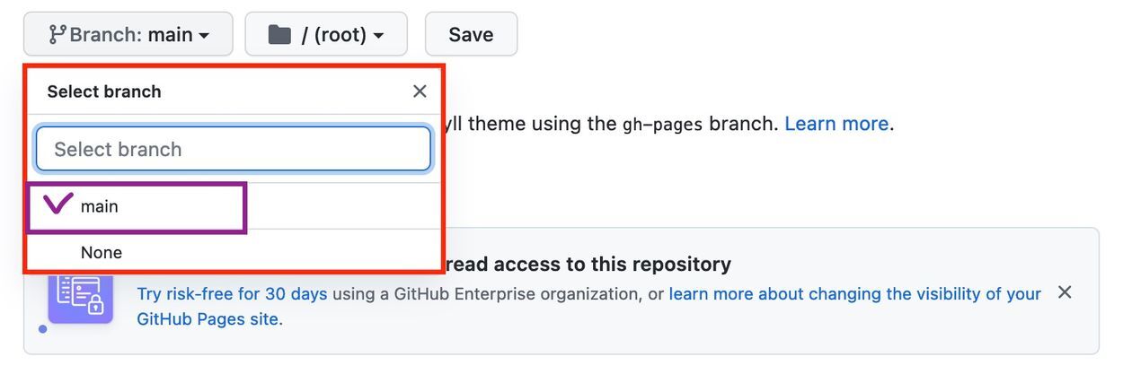 3) Source 하단의 셀렉트 박스를 클릭하면 branch를 선택할 수 있다. 보여주고자 하는 branch를 선택하고 Save 버튼을 누른다.
