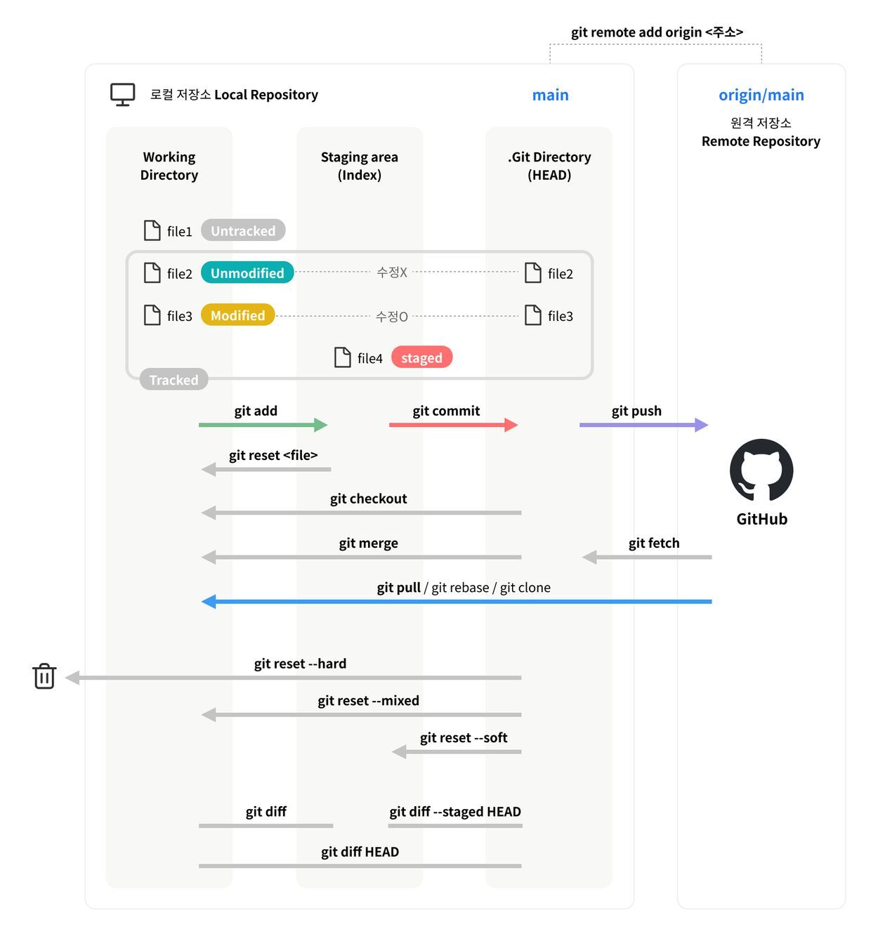 - Staged : 파일이 수정되고 나서 스테이지 공간에 올라와 있는 상태이며, git add 후의 상태
