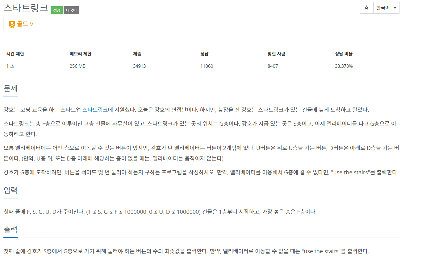 처음에는 DFS를 사용하여 S층에서 G층으로 갈 수 있는 모든 경우를 구하고, 그 경우에서 최솟값을 구하려고 하였다. 하지만 시간초과가 떴다. 그래서 구글링을 한 결과 BFS와 방문배열를 사용하여 문제를 풀었다. 층의 방문 여부를 저장하는 방문 배열을 사용하지 않는다면 메모리 초과가 뜬다.
