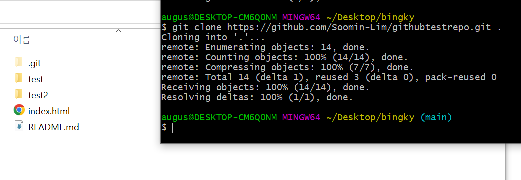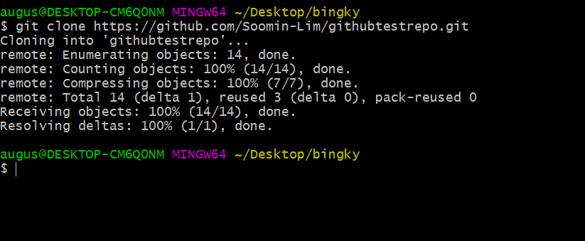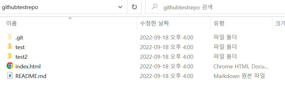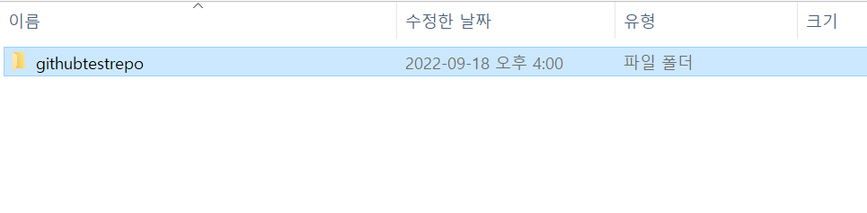 실행 결과 새로운 githubtestrepo 폴더를 생성한 후 코드를 받아온 것을 확인할 수 있다.