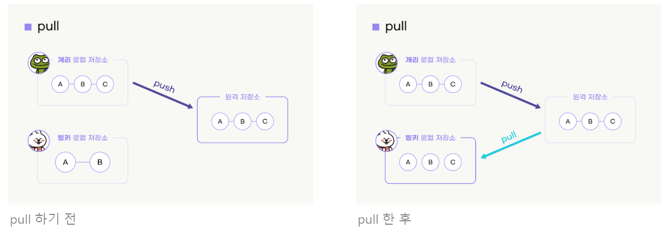 원격 저장소에 업데이트 된 데이터를 가져오고 병합할 때 사용한다.
