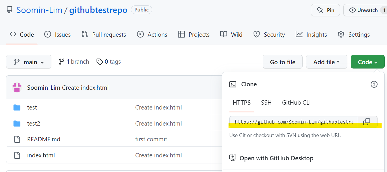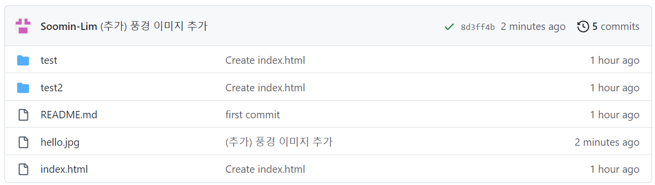 test 폴더의 index.html을 보고 싶으면 URL 창에 https://soomin-lim.github.io/githubtestrepo/test/index.html 을 입력하면 된다.