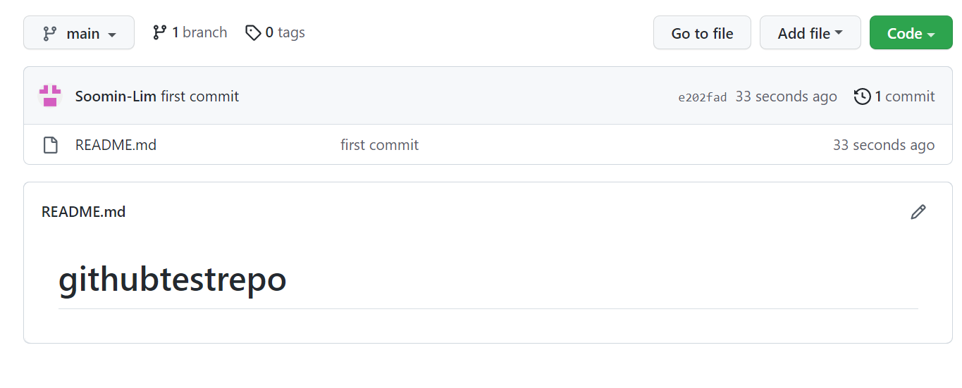 git bash에 위 명령어를 모두 입력하면 README.md파일이 GitHub 리포지토리로 들어가는 것을 확인할 수 있다.