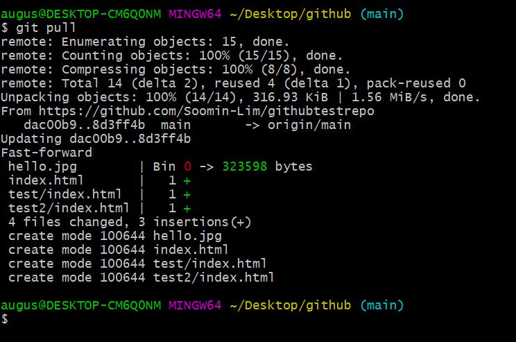 그러면 bingky는 git pull을 통해 원격 저장소에 있는 수정된 파일을 받아올 수 있다.