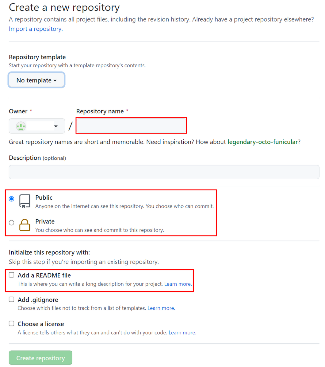 리포지토리 이름을 설정하고 Public(공개)/Private(비공개)를 설정한 후, Add a README file을 클릭하여 README file을 추가합니다. 설정이 완료되면 Create Repository를 클릭한다.