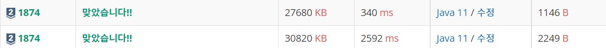 - 현재 top에 있는 숫자가 입력받은 숫자와 같으면 한 번만 pop한다.