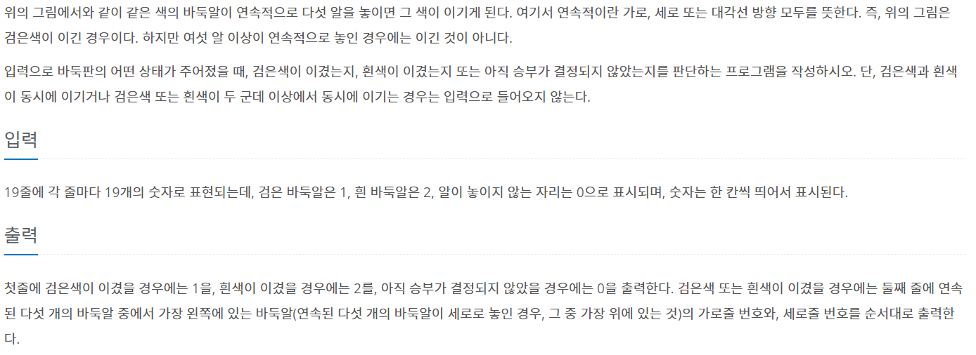 2. 이중 for문을 사용하여 바둑판을 왼쪽 위부터 탐색하고, 바둑알이 놓인 위치인 경우 check 함수를 호출하여 오목이 된 경우 검은색이 이겼을 경우에는 1을, 흰색이 이겼을 경우에는 2를 출력한다. 그리고 현재 위치를 출력하고 프로그램을 종료한다.