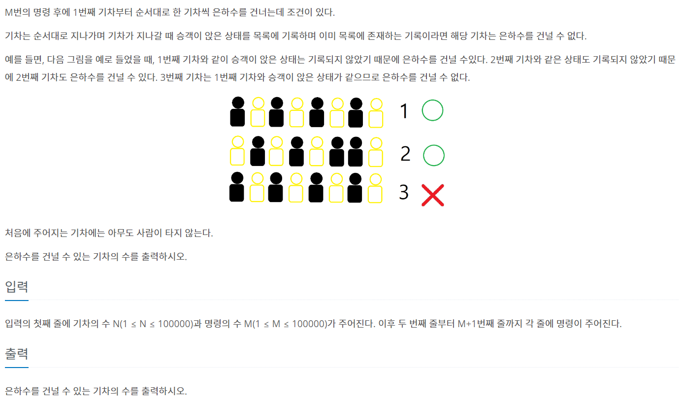 입력의 첫째 줄에 기차의 수 N(1 ≤ N ≤ 100000)과 명령의 수 M(1 ≤ M ≤ 100000)가 주어진다. 이후 두 번째 줄부터 M+1번째 줄까지 각 줄에 명령이 주어진다.