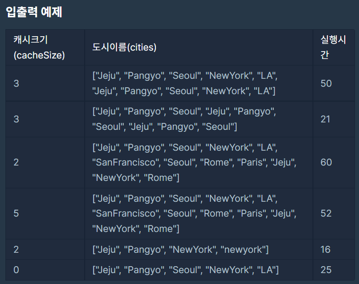 cacheSize가 0인 경우를 따로 처리해주어야 하며, 각 도시 이름은 대소문자 구분을 하지 않으므로 캐시에 저장할 때 소문자로 바꿔서 저장한다.