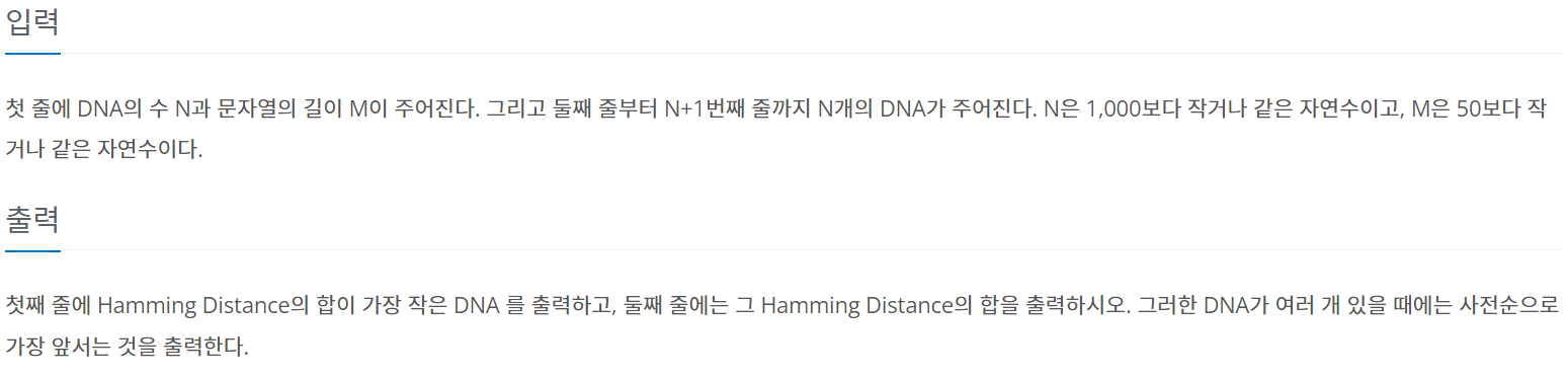 입력으로 들어온 모든 DNA와 Hamming Distance의 합이 가장 작은 DNA 를 출력해야 한다. 뉴클레오티드는 총 4가지이므로, 입력으로 들어온 n개의 DNA의 각 자리에 있는 글자들을 비교하여, Hamming Distance의 합이 가장 작은 뉴클레오티드를 찾으면 된다.